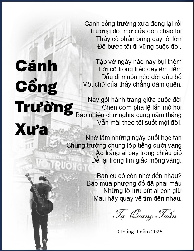 Mùa Thu, mùa của tựu trường đã gần kề khiến QUANG TUẤN nhớ đến Mái Trường Xưa, nhớ tuổi học trò, nhớ Thầy, nhớ bạn… Xin Mời quý vi thưởng thức những vần thơ hay trình bầy rất đẹp. Thân mến Hồng Thủy